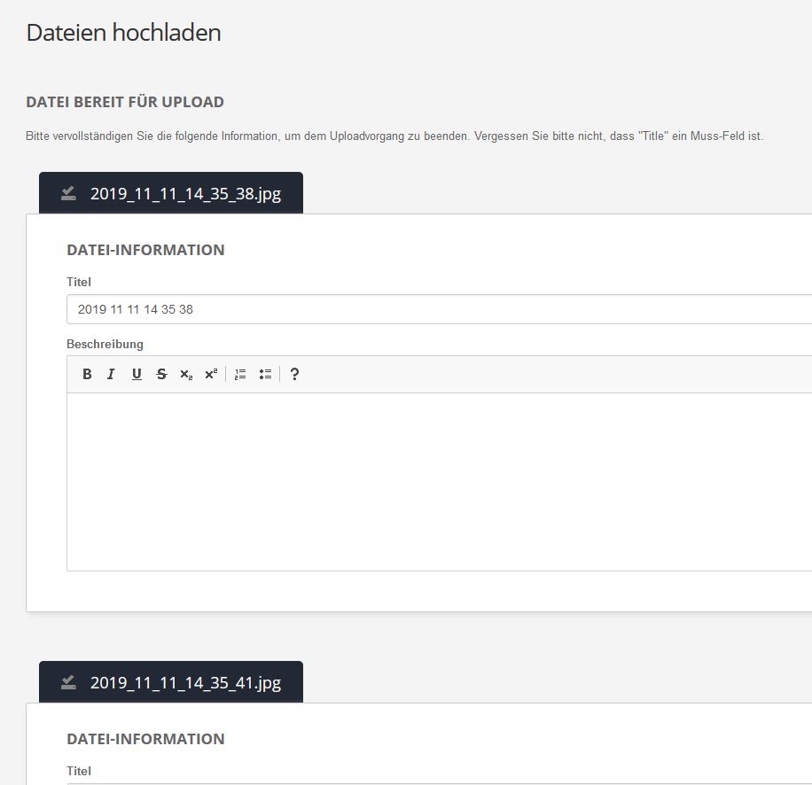 Danach können Sie die Dateien oder die Beschreibung nochmals bearbeiten. Über den Bereich "Dateien verwalten" können Sie ggf. auch einzelne Übertragungen nochmals löschen.